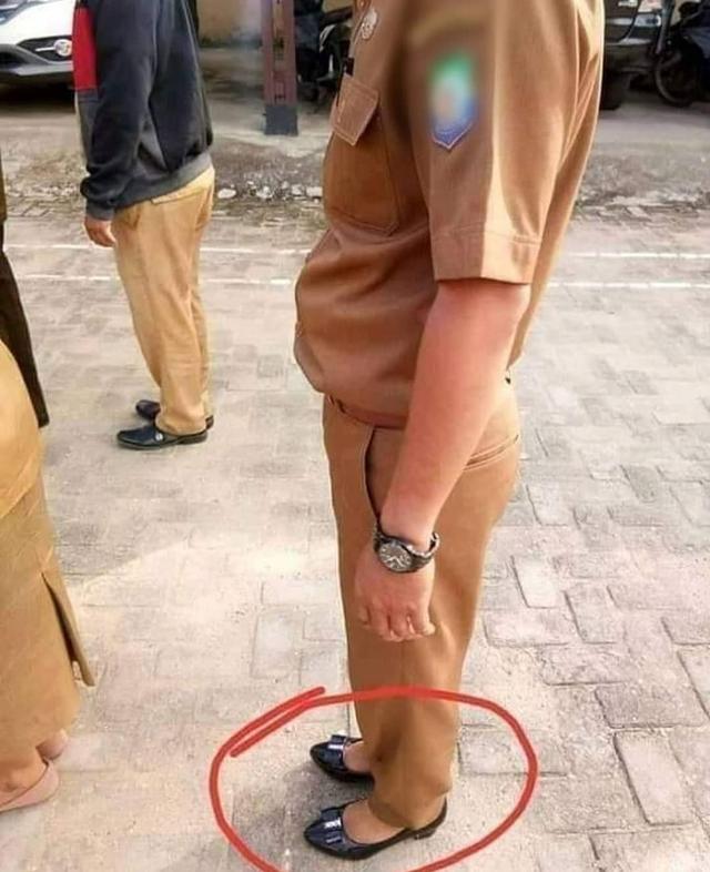 Kocak, seorang anggota PNS terlihat menggunakan sepatu wanita saat melakukan apel upacara. Diduga PNS laki-laki itu buru-buru saat akan kekantor, karena harus apel pagi hari
