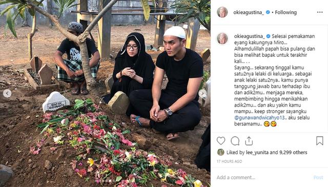 "Selesai pemakaman eyang kakungnya Miro... Alhamdulillah papah bisa pulang dan bisa melihat bapak untuk terakhir kali...," terang Okie.