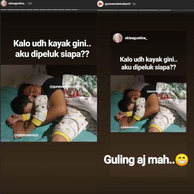Ternyata Okie mengunggah potret sang suami yang tampak tidur dan memeluk erat putra bungsunya, Miro.