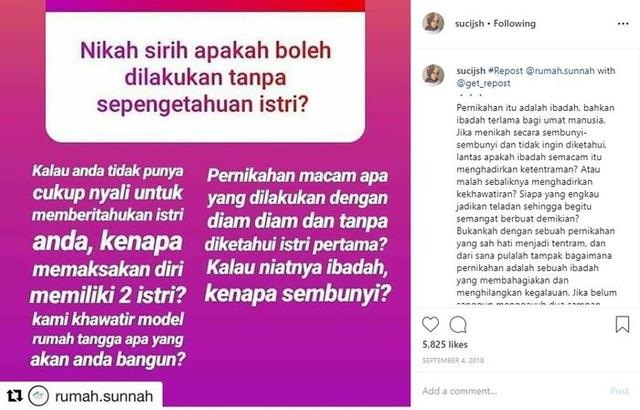 Soalnya unggahan itu menyinggung soal nikah siri yang dilakukan tanpa sepengetahuan istri pertama.