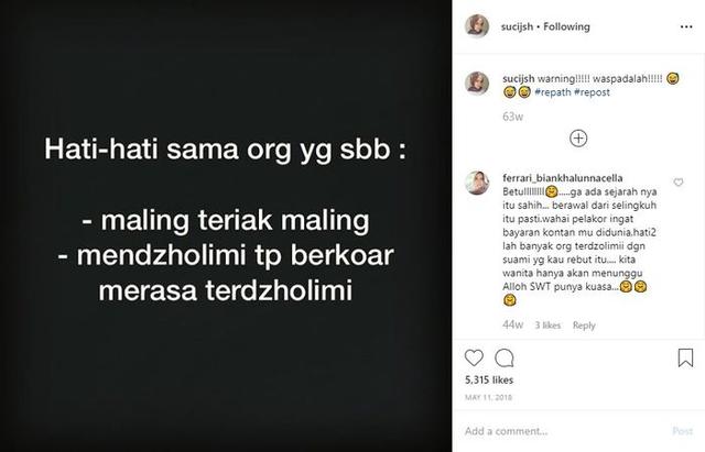 @dh***asch : 'Im with you mbak Suci. cuma ustadzah gadungan yg tega merebut suami sahabat sendiri pelakor berkedok ustadzah berlindung dalam syariah..'
