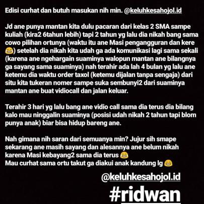 Suatu ketika, pria ini nggak sengaja bertemu dengan mantannya berkat aplikasi taksi online. Pria ini jadi driver sementara mantannya menjadi customer. Dari pertemuan ini, hubungan mereka semakin intens hingga akhirnya benih-benih cinta kembali bersemi. Wanita ini juga mengatakan kalau dia bersedia cerai dari suaminya demi bisa menikah dengan pria tersebut. Akhirnya, driver taksi online ini galau dan meminta bantuan netizen.